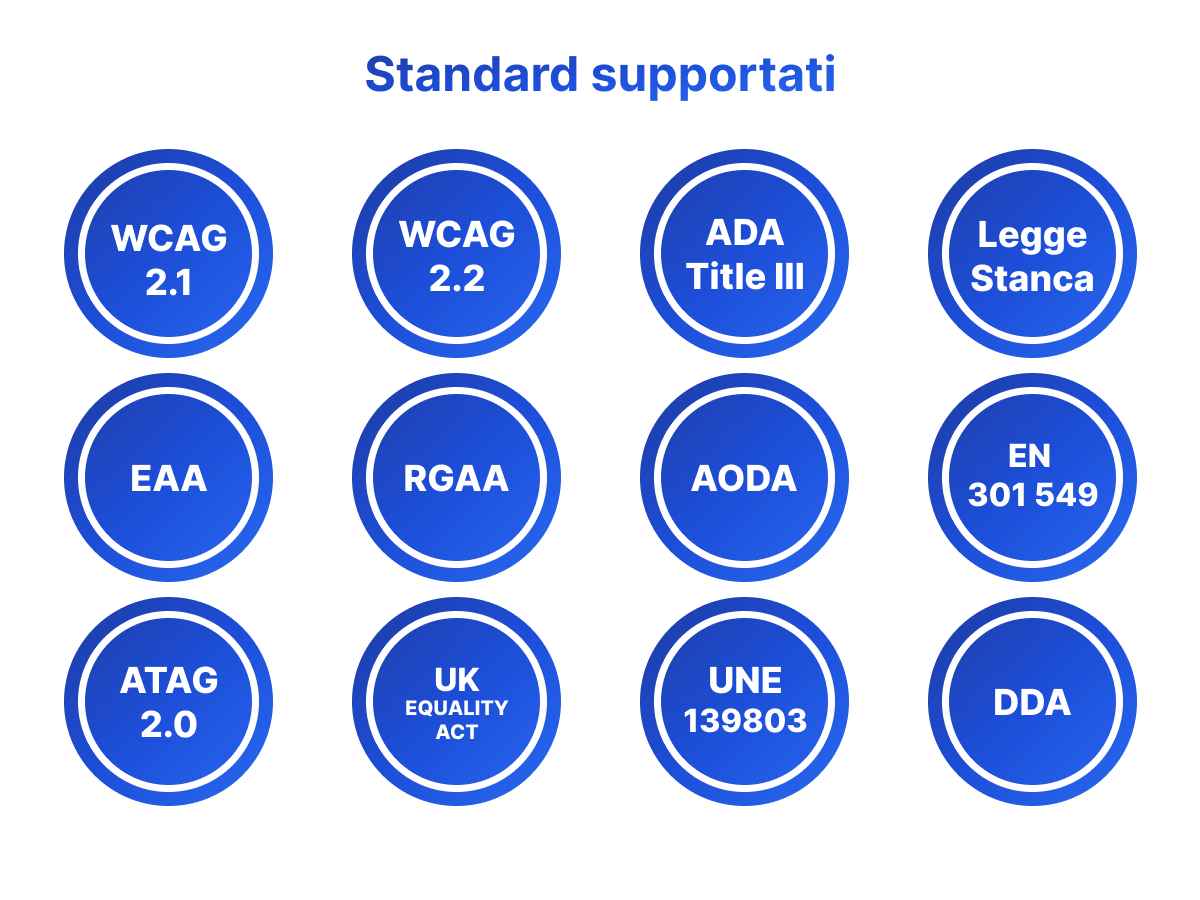 Il widget AxOrigin Accessibility aiuta a migliorare la conformità del sito alle normative ADA e a vari standard di accessibilità, tra cui: WCAG 2.0, 2.1 e 2.2; Section 508; California Unruh Act; RGAA (Francia); EAA EN 301 549 (Europa); UNE 139803:2012 (Spagna); Equality Act (Regno Unito); DDA (Australia); Standard 5568 (Israele); AODA (Ontario); ACA (Canada); BITV (Germania); Legge 26.653 (Argentina); LGIPD (Giappone); CRPD; Legge Stanca (Italia); e standard DDA (Svizzera).