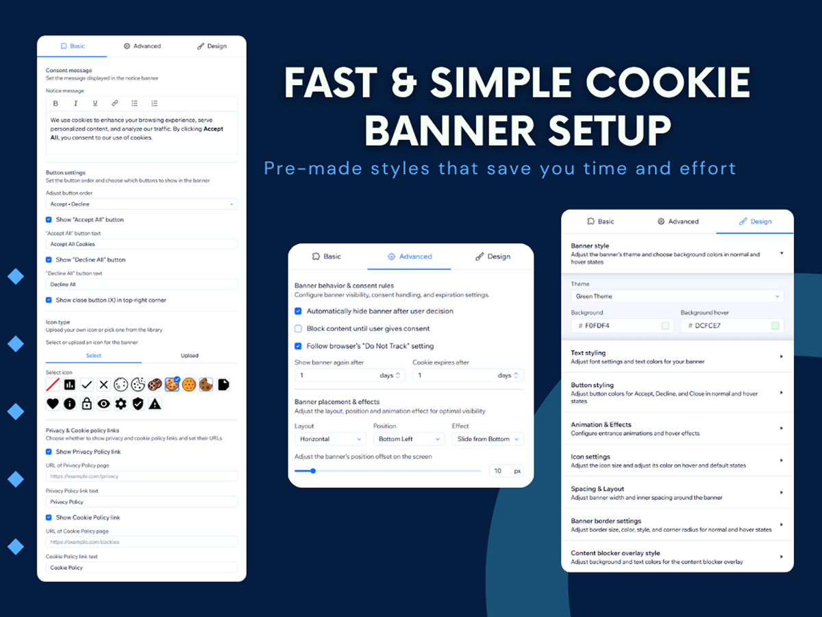 • Easy Setup & No Coding: Get your cookie banner live in minutes with a simple, no-code installation