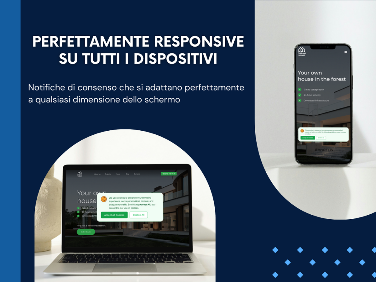 Scegli tra modelli di banner cookie già pronti e regola facilmente la loro posizione per adattarli allo stile del tuo sito web. Le opzioni di design semplici e pulite funzionano perfettamente su tutti i dispositivi, con banner responsivi ottimizzati per mobile e desktop.