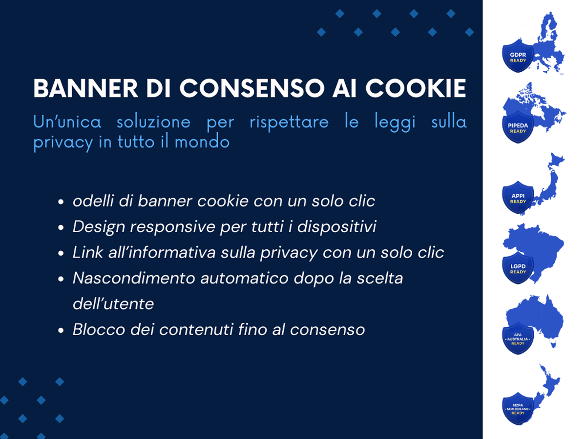Rendi il tuo sito web conforme a GDPR, RGPD, CCPA, PIPEDA, APPI, LGPD, APA, NZPA e alle leggi sulla privacy degli Stati Uniti in pochi minuti grazie a una soluzione di consenso cookie. Consenti ai visitatori di accettare, rifiutare o gestire i cookie nel rispetto delle normative sulla protezione dei dati.