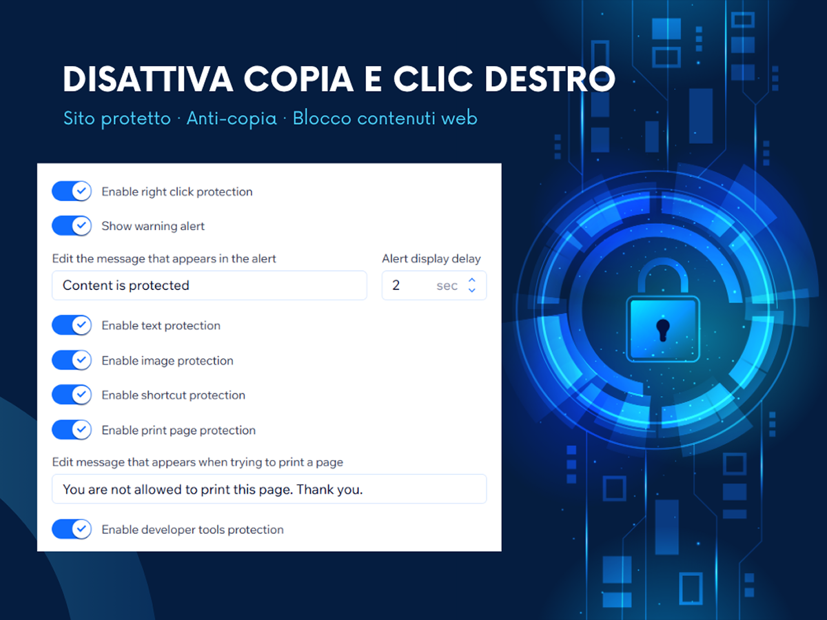 Proteggi il contenuto del tuo sito da copie, furti o usi impropri — in modo semplice e veloce.