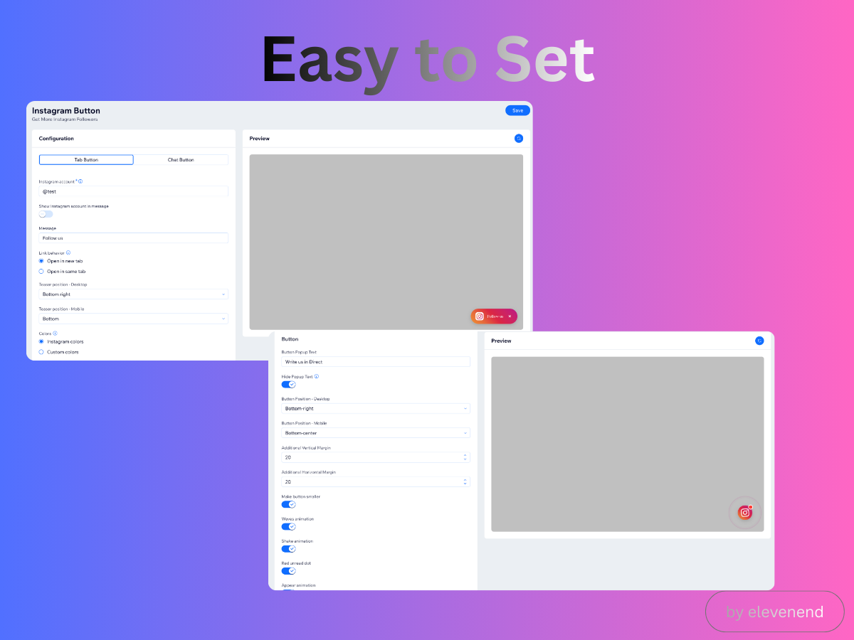 Choose between two styles: a teaser button that promotes your Instagram account or a messaging button that leads users straight to your DMs. Both are fully customizable and designed to convert visitors into followers.