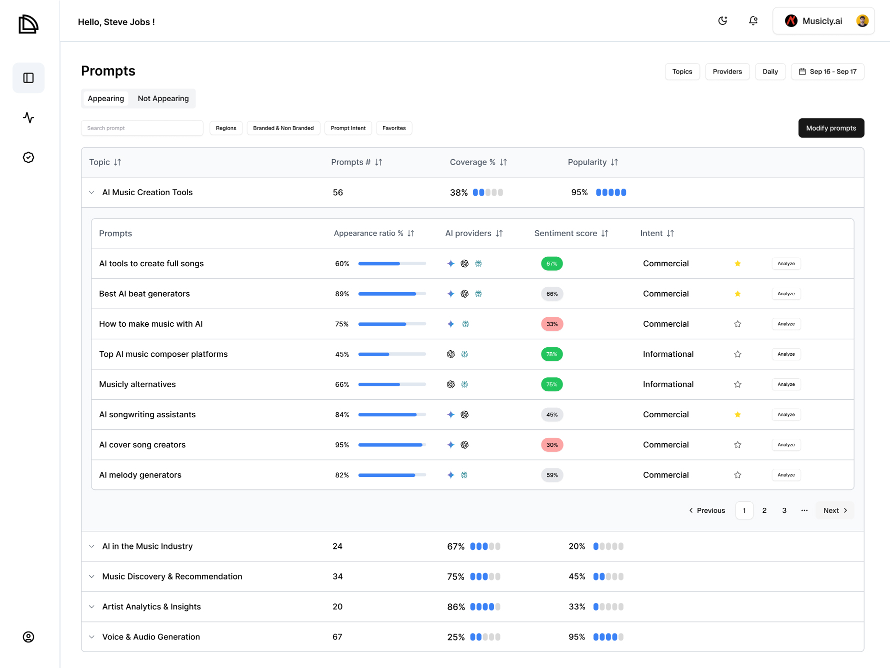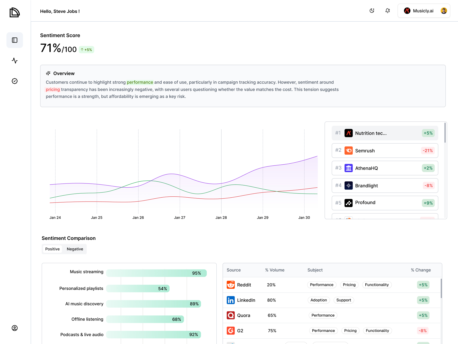 • Sentiment Analysis: understand whether AI mentions your brand in a positive, neutral, or negative tone across generated answers