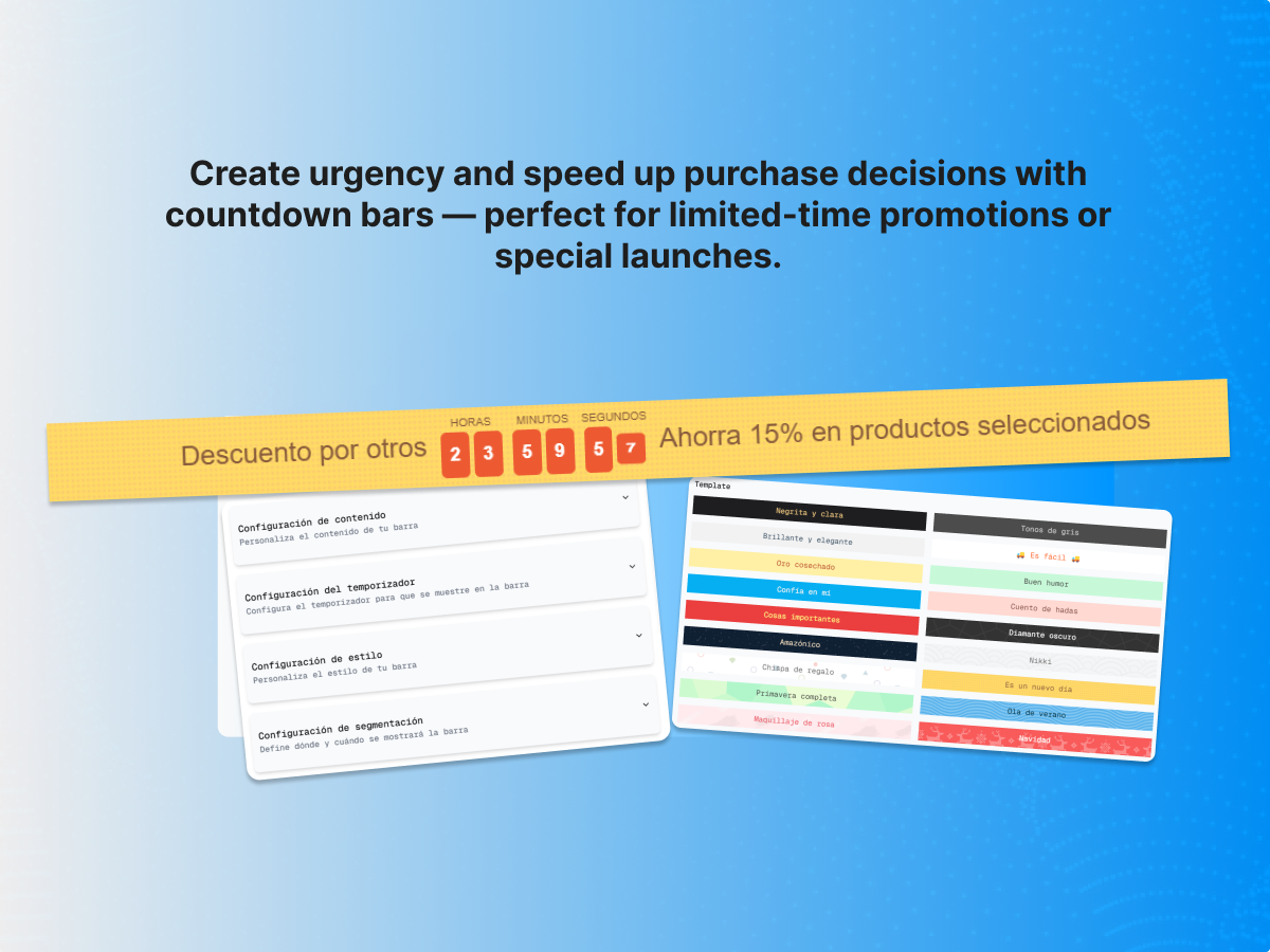 Add a countdown bar to your store, creating a sense of urgency for your customers and boosting sales by highlighting promotions or events