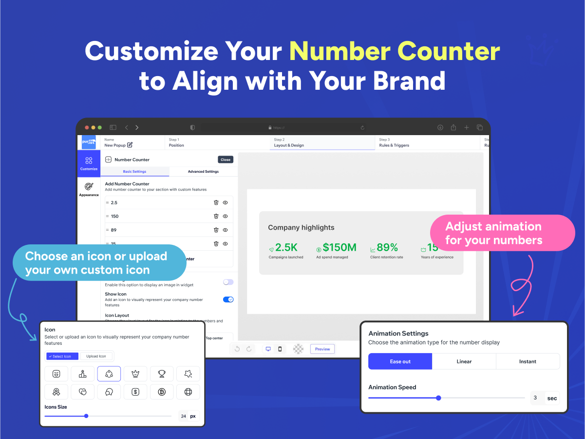 Muestre su éxito en movimiento con una pantalla animada elegante que convierte sus números en visuales potentes. El widget del Contador de Números le permite mostrar hitos clave, cifras de ventas, clientes satisfechos o proyectos completados con animaciones suaves que capturan la atención e inspiran confianza. Ya sea para un sitio web empresarial, portafolio o organización sin fines de lucro, es la manera perfecta de resaltar sus logros.