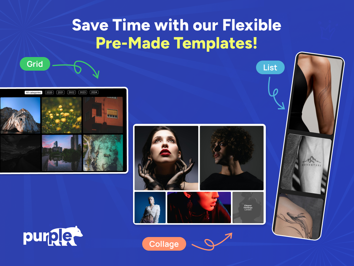 Diseños versátiles: elige entre vistas en cuadrícula, collage o lista para mostrar tu trabajo de forma hermosa.