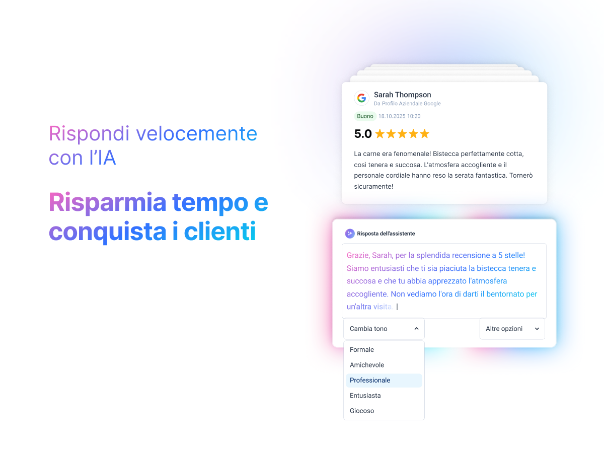 Converti più velocemente con l'IA: pubblica post intelligenti sui social e rispondi automaticamente alle recensioni