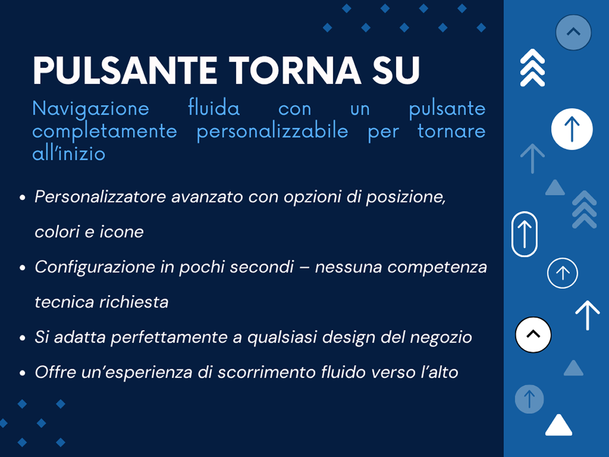 Migliora l’esperienza utente del tuo sito con un pulsante “Torna su” completamente personalizzabile — perfetto per pagine lunghe e navigazione mobile.