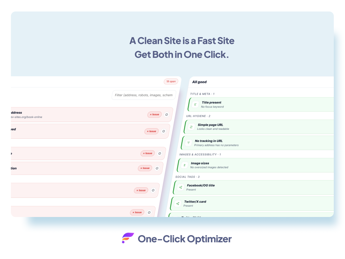 One-Click Optimizer is a streamlined tool that automatically applies essential SEO improvements in just a few minutes. The app analyzes a website and generates a tailored optimization plan that can be applied instantly with a single click, eliminating the need for technical skills or manual adjustments.