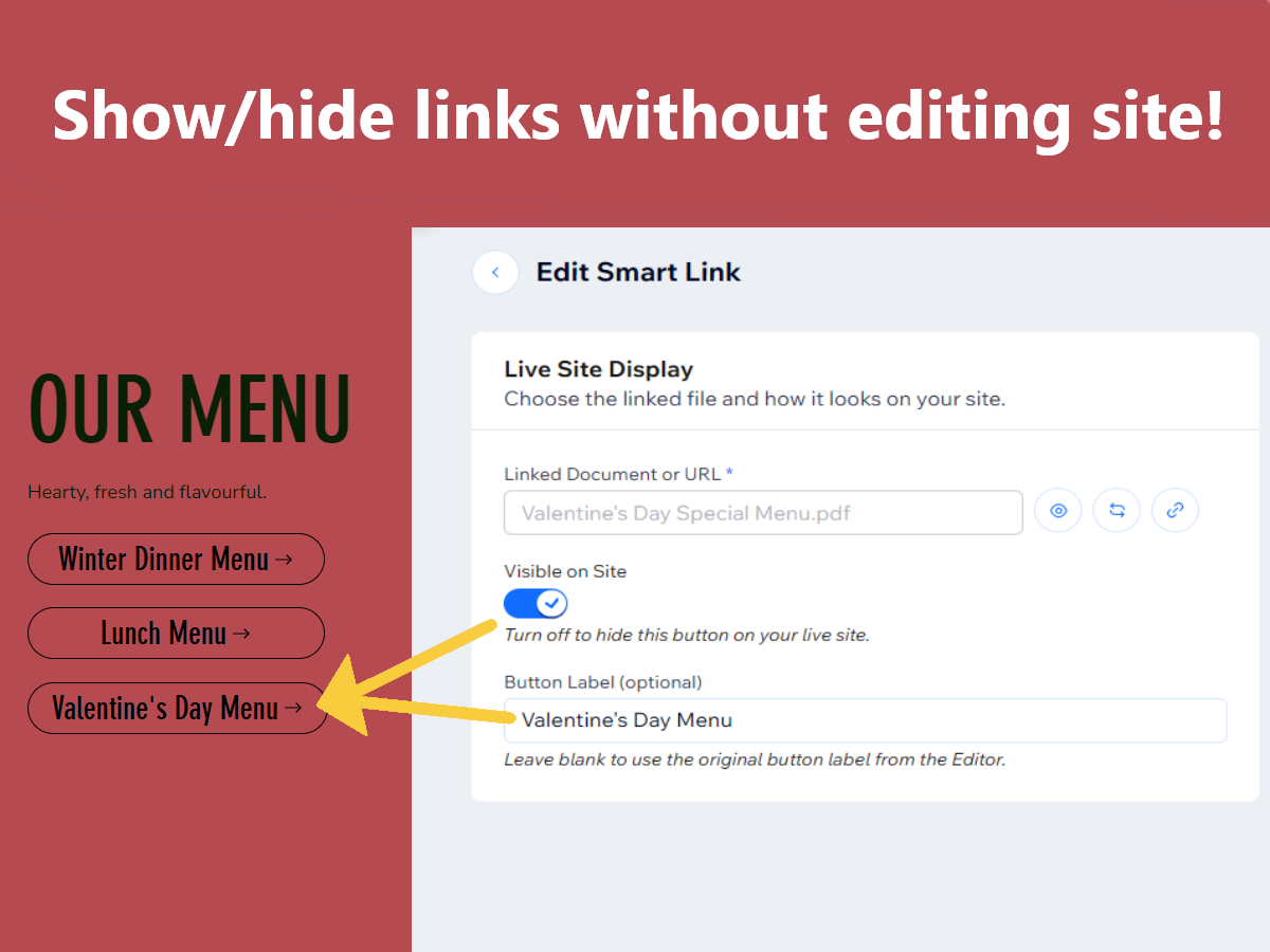 Keep your website up-to-date—without opening the editor. The Smart Links App lets you create buttons that connect to files or URLs you can change anytime right from the dashboard. Swap a document, update a link, rename the button, or hide it completely—your live site updates instantly, no republish required. Easy to Set Up – Add a Smart Link widget, connect it to a file or external link, and style it like any site button. When the document changes, upload the new file in the dashboard and the site changes instantly. Dashboard-First Workflow – Anyone with dashboard access can update documents or adjust visibility—saving time and avoiding risk of accidental site changes.