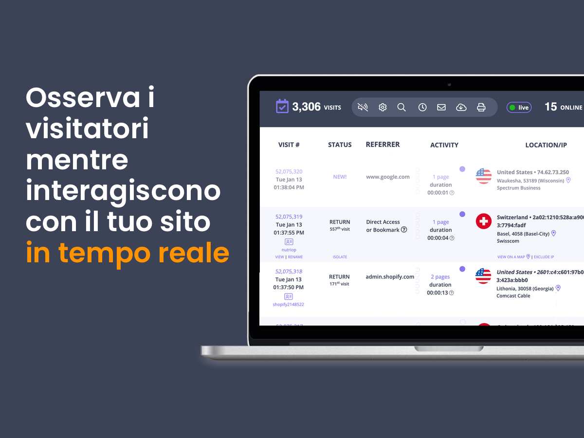 Monitoraggio live delle interazioni: segui i visitatori durante tutta la loro visita in tempo reale. Scopri come navigano tra le pagine, dove si soffermano e come interagiscono con i tuoi contenuti — mentre accade.pagina