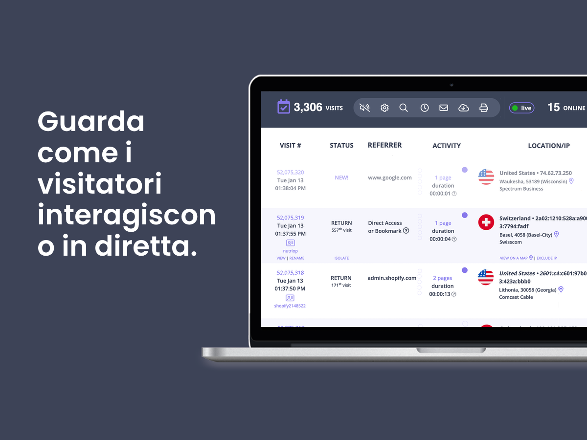 Monitoraggio live delle interazioni: segui i visitatori durante tutta la loro visita in tempo reale. Scopri come navigano tra le pagine, dove si soffermano e come interagiscono con i tuoi contenuti — mentre accade.pagina