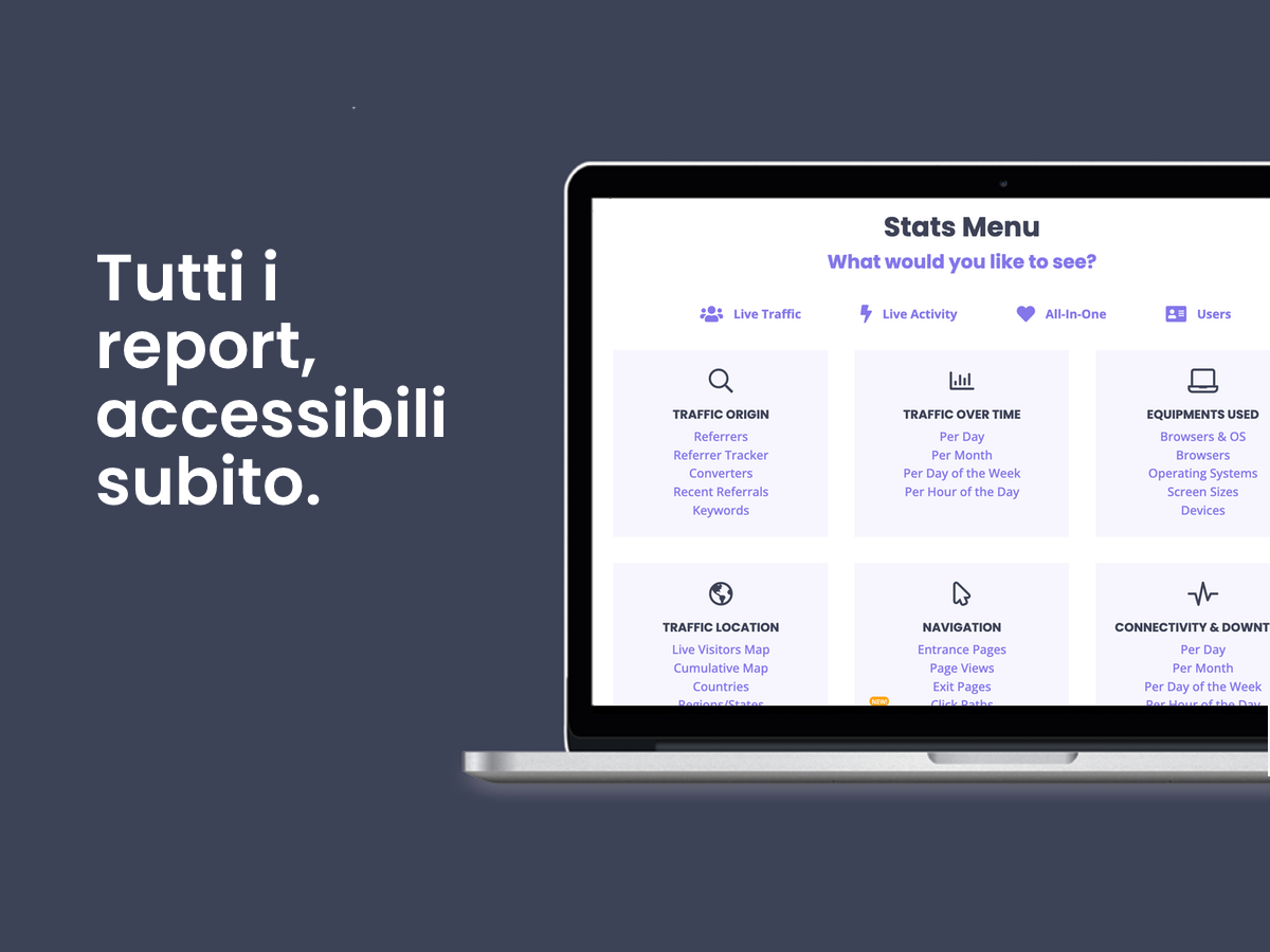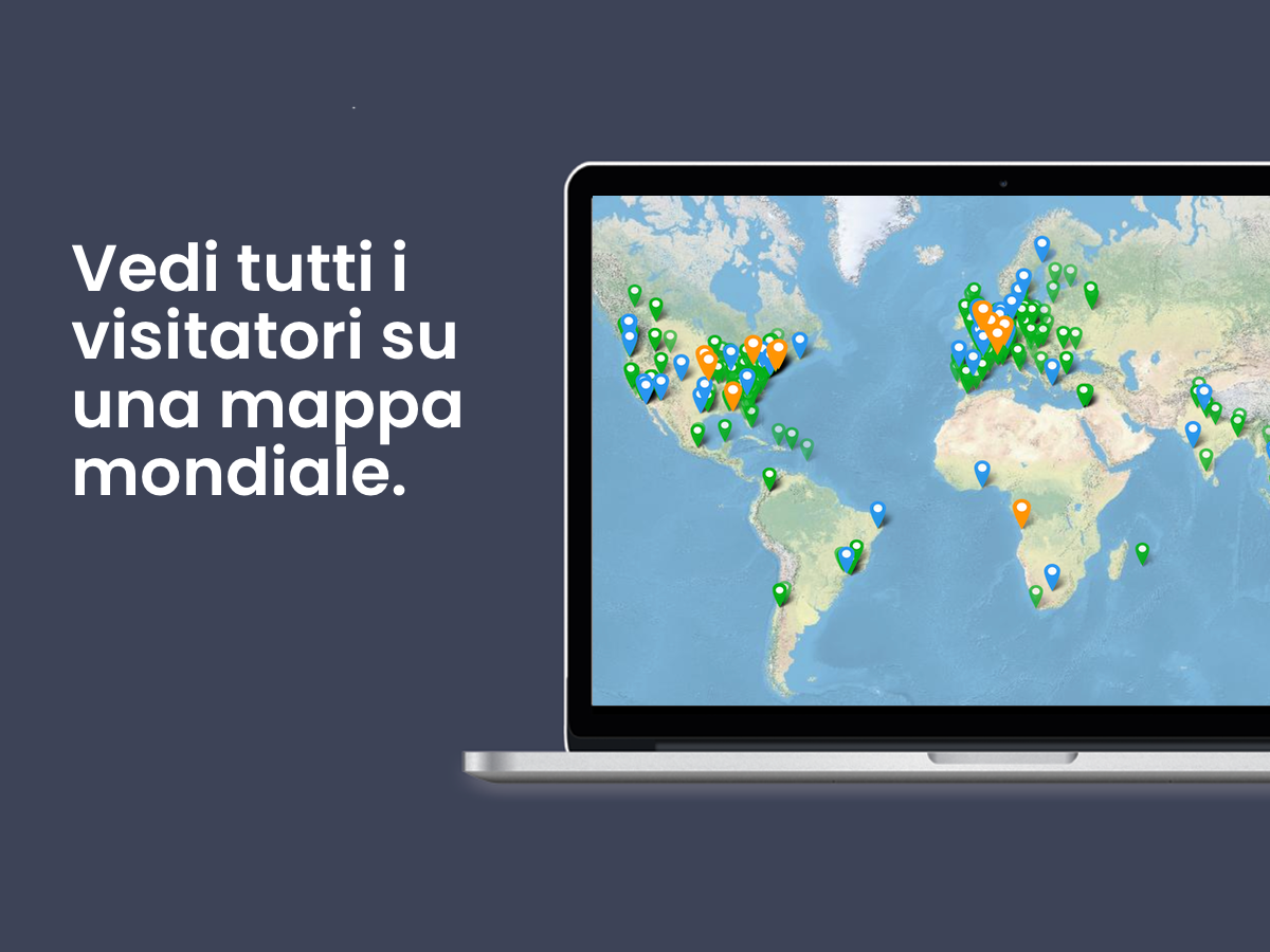 Report, avvisi e widget del sito: ricevi report dettagliati via e-mail, avvisi per nuovi visitatori, conversioni o problemi del sito e condividi le informazioni tramite widget integrabili, come le mappe visitatori in tempo reale.