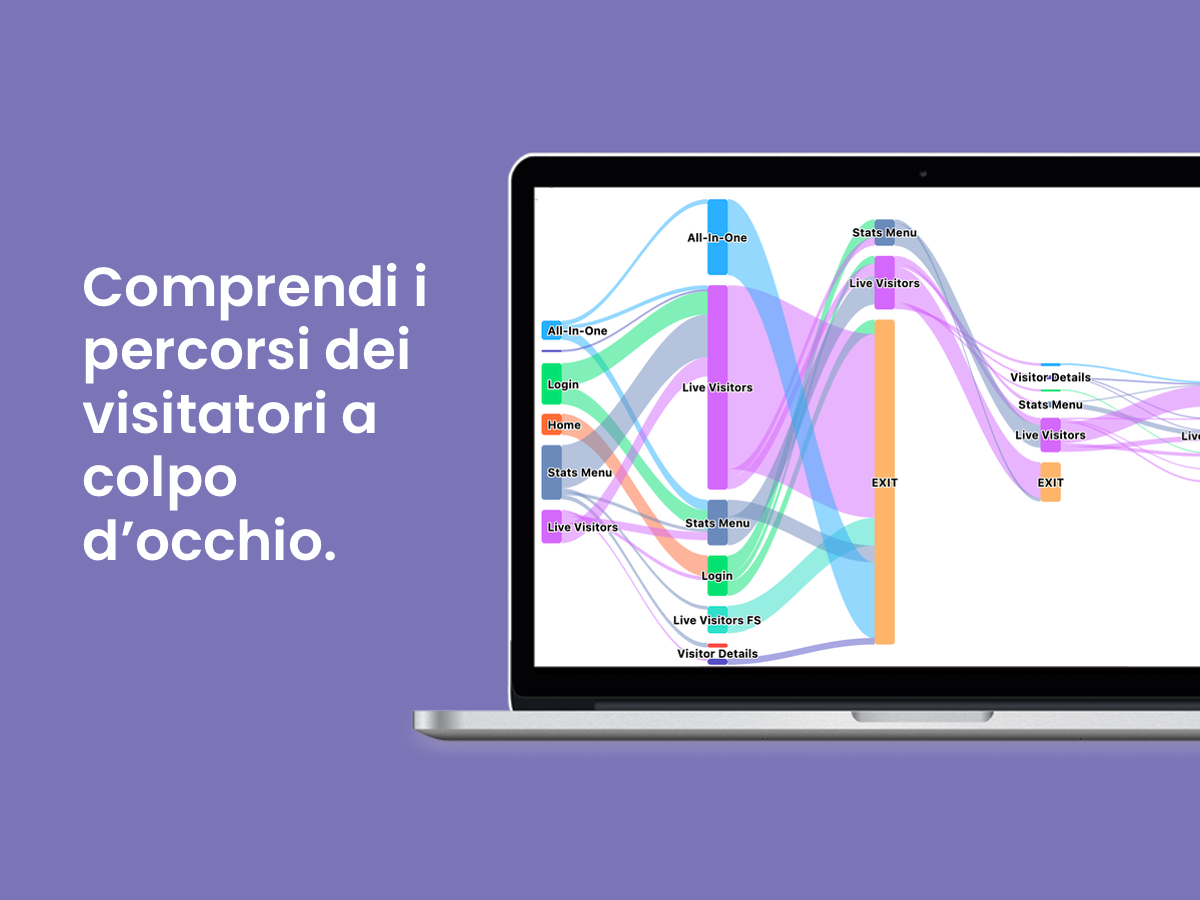 Segui i visitatori dall’ingresso all’uscita: scopri da dove arrivano, come navigano tra le pagine, quanto tempo restano e quali contenuti attirano maggiore attenzione. Tutti i dati sono mostrati in report chiari e leggibili, senza bisogno di competenze tecniche.