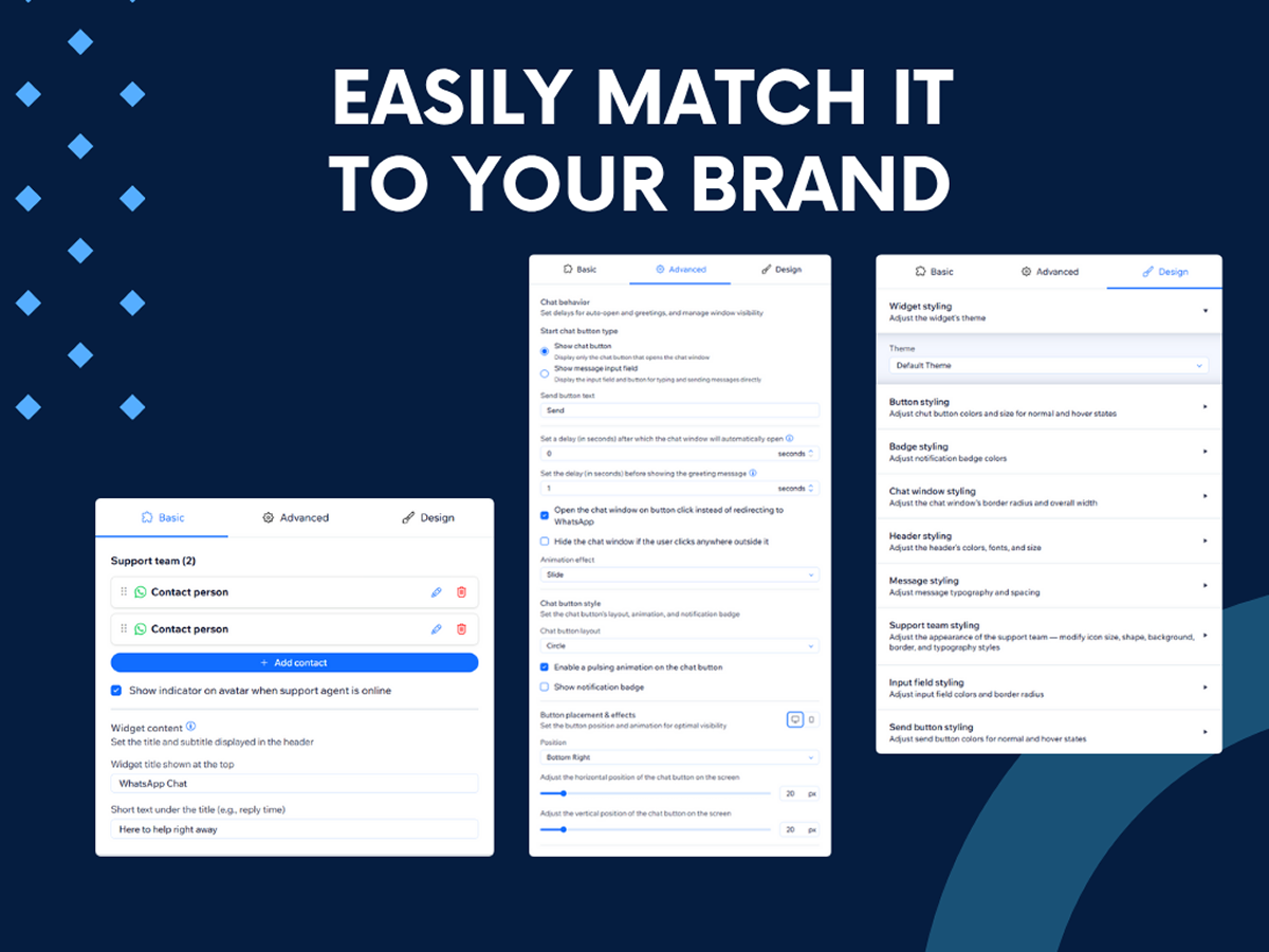 WhatsApp Chat lets your website visitors contact you instantly via WhatsApp. Add a WhatsApp chat button to your site in minutes — no coding required. Provide fast customer support with multiple contact options, letting visitors instantly reach the right team member. Boost engagement, increase conversions, and stay connected with customers on their favorite messaging app. Easily customize colors, text, and icons to match your brand and create a seamless live chat experience. Whether it’s answering questions, guiding purchases, or offering real-time support, WhatsApp Chat helps you build stronger relationships and turn visitors into loyal customers.